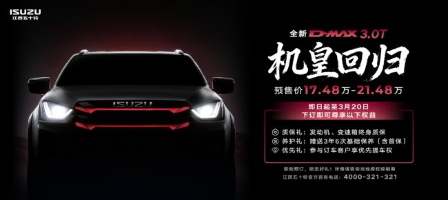曾经叱咤皮卡江湖的“机皇”,如今强势回归。江西五十铃全新D-MAX 3.0T火热预售中,官方预售价区间为17.48万-21.48万元,新车迅速点燃市场热情,吸引大批皮卡老炮儿争抢先机,全国订单量持续攀升。现在下订,可享三重限时专属礼遇:3年6次基础保养(含首保