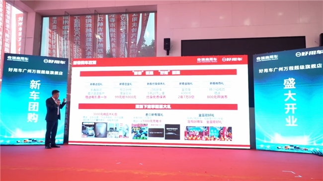 10:05,新车揭幕仪式精彩上演,江文波总与隋玉新总共同为新车揭幕,全新展车惊艳亮相,为广州市场注入全新活力。随后,万程公司总经理郑士强登台公布好用定制车专属政策方案,丰厚的福利、优惠的方案,让现场司机朋友倍感惊喜,也彰显了双店服务客户、回馈市场的诚意。