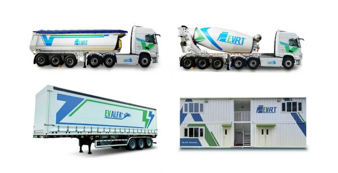 图为EV-DTB·渣土车、EV-DTB·搅拌车、EV-DTB·冷藏车