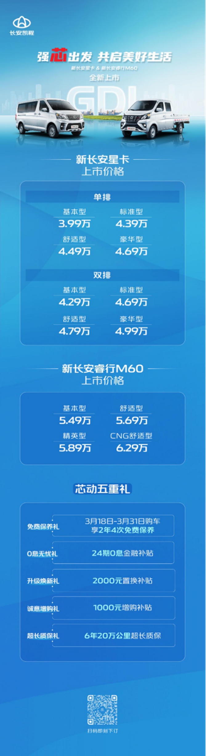 在创富者的瞩目中,两款新车正式上市。其中,新生代强动力微卡-新长安星卡官方指导价3.99万元起,强动力宽体大微客-新长安睿行M60官方指导价5.49万元起。