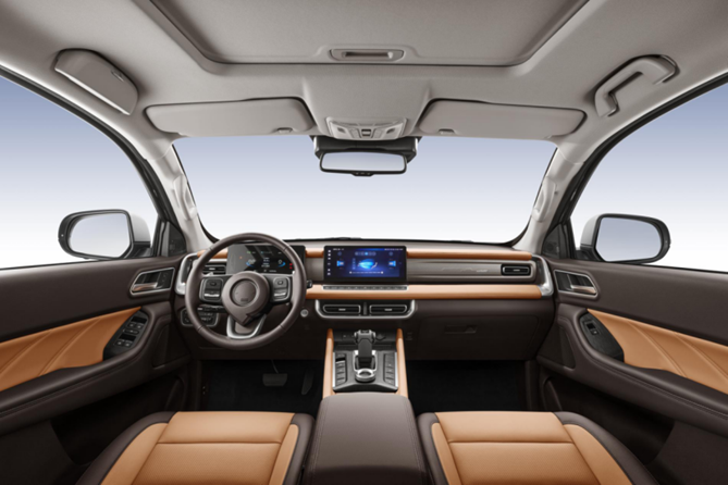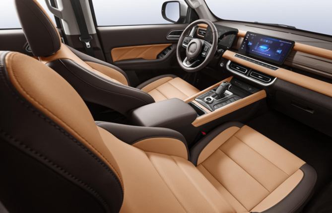 2023款乘用炮采用全新精致科技风内饰,大面积软质包覆、7英寸彩色液晶仪表+12.3英寸智联触控屏双悬浮设计、镭雕工艺发光装饰板,科技感爆棚。此外,仪表板左右增加大储物盒,增加储物空间,同级领先。